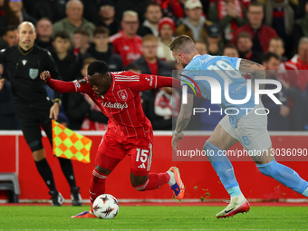 Arnaud Kalimuendo of Nottingham Forest is under pressure from Pontus Jansson of Malmo FF during the UEFA Europa League League Phase match 5 between Nottingham Forest and Malmo FF at the City Ground in Nottingham, England, on November 27, 2025.