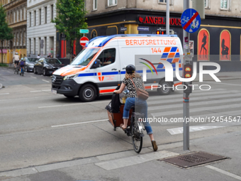 An ambulance from Berufsrettung Wien drives through urban traffic during an emergency call while a woman on a cargo bicycle waits at a red light in Vienna, Austria, on June 7, 2025. The scene captures a typical moment of coexistence between emergency services and civilian mobility in the city.