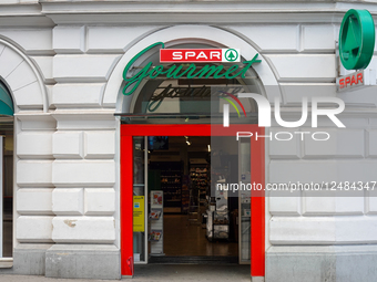 The entrance of a SPAR Gourmet supermarket branch is seen in Vienna, Austria, on June 7, 2025. The storefront features a red-framed doorway beneath the brand's signage on a historic-style building facade.
