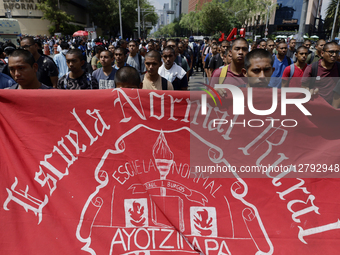 Normal school students from Ayotzinapa march with mothers and fathers of the 43 missing normal school students from Iguala along Paseo de la Reforma Avenue in Mexico City, Mexico, on September 24, 2025, to demand justice and punishment for those responsible for the disappearance of their children almost 11 years after the events that occur in Iguala, Guerrero.