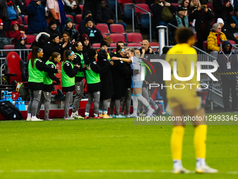 Kaylee Hunter #11 of AFC Toronto celebrates her goals with the AFC Toronto bench during the Northern Super League Grand Finals between AFC Toronto and Vancouver Rise at BMO Field in Toronto, Ontario, Canada, on November 15, 2025.