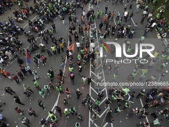 In Jakarta, Indonesia, on May 20, 2025, hundreds of online transportation partners hold a demonstration in the Horse Statue area, Central Jakarta. They demand that online transportation application makers in Indonesia reduce the fee deduction from 30% to 10%, as they find it burdensome.