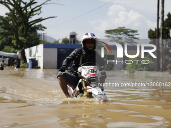 A motorcyclist crosses a flood in Dayeuhkolot, Bandung Regency, West Java, Indonesia. After heavy rain sweeps through the area, the overflowing Citarum River inundates residential neighborhoods with water levels ranging from 50 centimeters to two meters, disrupting daily activities and paralyzing transportation access.