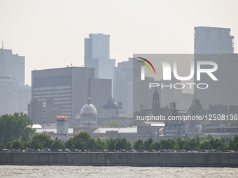 MONTREAL, CANADA - June 6: A view of downtown Montreal, featuring a mix of modern skyscrapers and historic architecture overlooking the St. Lawrence River, as seen from the Old Port of Montreal, in Montreal, Quebec, Canada, on June 6, 2025.