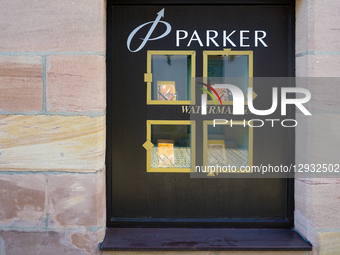 The Parker and Waterman pen brand logos are displayed on a small window display set into a stone wall in Roth, Bavaria, Germany, on October 18, 2025. Both brands are internationally recognized for producing luxury and fine writing instruments.
