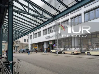The exterior of the Ostbahnhof (Munich East Station) features its name prominently, with parked taxis and a covered walkway, in Munich, Bavaria, Germany, on November 7, 2025. The station is a key DB (Deutsche Bahn) hub for public transport and transportation services.