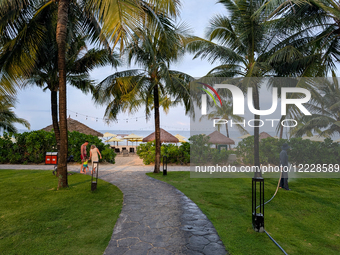 A resort staff member waters a green lawn surrounded by tall palm trees as guests walk along a path in Phu Quoc, Vietnam, on April 5, 2025. The tropical landscape is part of a beachfront resort near Bai Truong along the Gulf of Thailand.