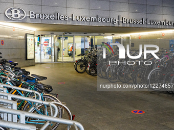 Bicycles park outside the entrance to Bruxelles-Luxembourg railway station in Brussels, Belgium, on July 30, 2023. The station is located in the European Quarter beneath the Esplanade of the European Parliament and is part of the European Parliament complex, serving commuters and visitors to EU institutions.