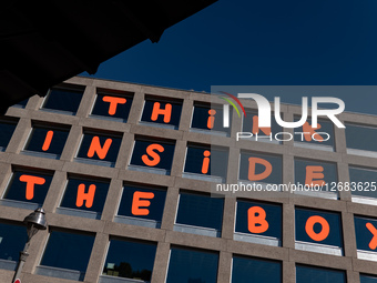 A storage box advertisement reads 'Think inside the box' by Oberbaumbruecke in Berlin, Germany, on August 21, 2025.