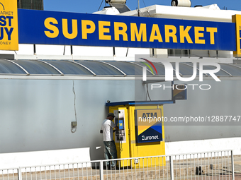 AYIA NAPA, CYPRUS – OCTOBER 18: A view of the Euronet ATM machine outside the Best Buy Supermarket logo outside a shop in Ayia Napa, Cyprus, on October 18, 2025.