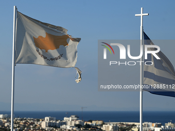 DERYNEIA, CYPRUS – OCTOBER 17: A view of the Cyprus and Greek flags in Deryneia, Cyprus, on October 17, 2025.