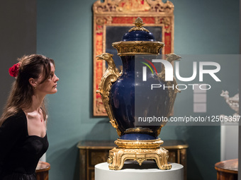LONDON, UNITED KINGDOM - JUNE 26, 2025: A staff member looks at A Late Louis XV Ormolu-Mounted 'Bleu Turque' Chinese Porcelain Vase And Cover Of Exceptionally Large Size, estimate: GBP500,000 - 800,000 during a photocall at Christie's auction house ahead of The Exceptional Sale in London, United Kingdom on June 26, 2025.