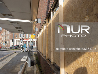 Boarded up with wood panels broken windows. The aftermath of the anti-curfew unrest in Rotterdam. Damaged windows of shops, cafes, fast-food chain, destroyed pavement, broken ATM machines, bus stop, tram stops, damaged windows and glasses even in a residential area have been caused by the violent protesters who clashed with the police and looted the area around Groene Hilledijk, Beijerlandselaan and Randweg. It is the 3rd consecutive night of riots and clashes with the polices after the government imposed the curfew to fight the spread of the Covid-19 Coronavirus pandemic and the new mutation, as the previous lockdown didn't keep the infection numbers low. People in the Netherlands are no longer allowed to be outside between 21:00 and 04:30 local time, while violators face a penalty fee of 95euro. Rotterdam, the Netherlands on January 26, 2021