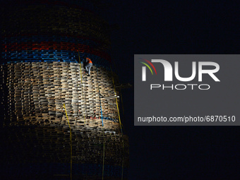 A bonfire builder works on the 11th Night bonfire in Craigy Hill, Larne, ahead of the July 11th celebration organized by members of the Loyalists Orders. The bonfire consists of 17,000 pallets (286 pallets high equivalent of 45 metres) collected by the Loyalists to mark the opening of the annual Orange Parade on July 12. The parade celebrates the victory of the Protestant King William of Orange over the Catholic King James II at the Battle of Boyne in 1690. On Sunday, 11 July 2021, in Larne, County Antrim, Northern Ireland
