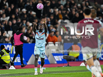 Michael Kayode (33 Brentford) takes a throw-in during the Premier League match between West Ham United and Brentford at the London Stadium in Stratford, United Kingdom, on October 20, 2025.