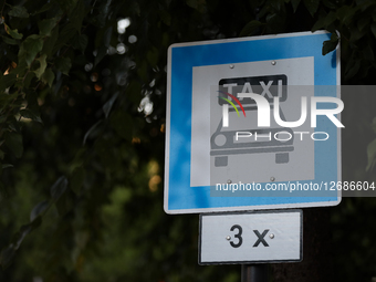A taxi rank sign is seen on the street in Budapest, Hungary, on August 20, 2025.