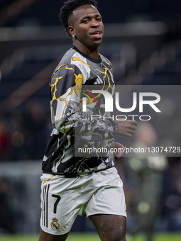 Vinicius Junior of Real Madrid warms up during the LaLiga EA Sports football match between Real Madrid CF and RC Celta de Vigo at Estadio Bernabeu in Madrid, Spain, on December 7, 2025.
