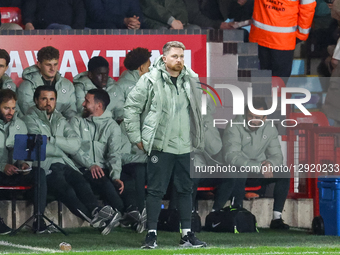 Calum McFarlane, manager of Chelsea FC U21, watches as play commences during the Vertu Trophy match between Walsall and Chelsea at the Banks's Stadium in Walsall, on October 28, 2025.