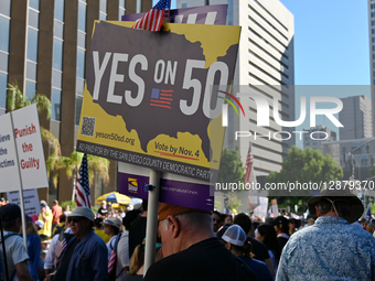 Demonstrators protest the Trump administration during a second round of ''No Kings'' protests in San Diego, California, on October 18, 2025, on the same day as US Vice President JD Vance attends the 250th anniversary celebration of the Marine Corps at Camp Pendleton. A protestor carries a ''Yes on 50'' California redistricting sign that promises to reshuffle Congressional representation in the state. About 2,500 ''No Kings'' events are planned worldwide, including at least 14 in San Diego County with more than 25,000 people, according to police.