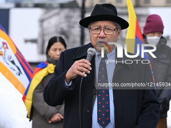 OTTAWA, CANADA - MARCH 10: Samphe Lhalungpa, Chair of the Board of the Canada-Tibet Committee (CTC), speaks to Tibetan community members and supporters outside the Canadian Parliament on March 10, 2024, in Ottawa, Ontario. The gathering marks the 66th anniversary of Tibetan National Uprising Day, commemorating the 1959 Tibetan uprising and the Women's Uprising of March 12, 1959, when thousands of Tibetan women protested against Chinese rule.
