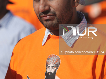 "Canadian Sikh man wearing a T-shirt with the image of Jarnai..."