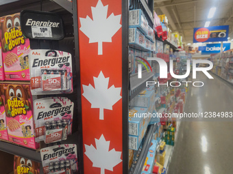 EDMONTON, CANADA - MAY 7: A close-up of product stickers featuring the maple leaf symbol (Made in Canada) is seen inside a popular supermarket chain in Edmonton, Alberta, Canada, on May 7, 2025.