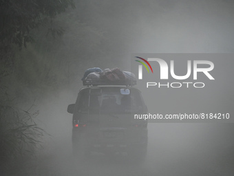 Car on a dusty road from Machu Picchu to Santa Teresa hydroelectric power plant. On Thursday, 21 April 2022, in Santa Teresa, Cusco, Peru.