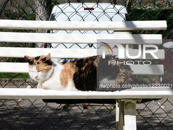 A cat on a bench is available for adoption at the Saint-Etienne Animal Protection Society in Saint-Etienne, France, on April 5, 2025.
