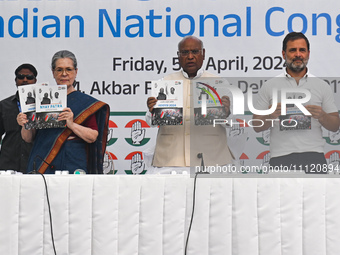 The leaders of India's main opposition party, the Indian National Congress, are posing for photographs during the release of the party's manifesto ahead of the Indian General Elections. From left to right are P. Chidambaram, Sonia Gandhi, Rahul Gandhi, party president Mallikarjun Kharge, and K.C. Venugopal, at the party headquarters in New Delhi, India, on April 5, 2024.