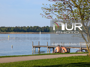 People relax on the shore of Lake Chiemsee near blooming trees and wooden piers in Prien am Chiemsee, Bavaria, Germany, on May 2, 2025. The calm weather and vivid spring colors create a setting for sunbathing, sailing, and experiencing nature along the lakeside promenade.