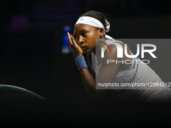 RIYADH, SAUDI ARABIA - NOVEMBER 6: Coco Gauff of the United States plays against Aryna Sabalenka during their group-stage match on Day 6 of the 2025 WTA Finals, part of the Hologic WTA Tour, at King Saud University Indoor Arena in Riyadh, Saudi Arabia, on November 6, 2025.