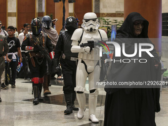 Visitors dressed in Star Wars costumes spend time during the Indonesia Comic Con (ICC) x Indonesia Anime Con (Inacon) 2025 in Jakarta, Indonesia, on October 26, 2025. The event, themed ''Pop Culture Crossover Celebration of the Year,'' features a variety of activities showcasing the latest trends in cosplay, comics, anime, video games, and Indonesia's creative fandom communities