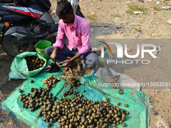 A seller arranges and sells water snails at a regulated fish market in Siliguri, India, on December 3, 2025. It is also eaten in many parts of India with rice or bread.