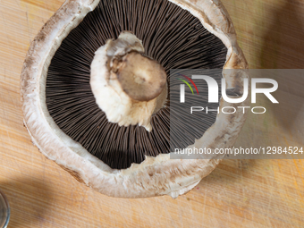 Pairs of Portobello mushrooms are seen on a cutting board with a knife in Warsaw, Poland on 13 November, 2025.