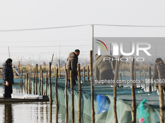Crab farmers are catching crabs at a hairy crab breeding base in Suqian, Jiangsu Province, China, on December 2, 2023.
