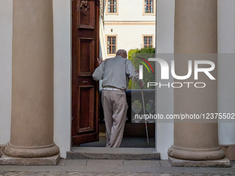 An elderly man using a forearm crutch enters a historic building through a wooden doorway flanked by columns in Prague, Czech Republic, on May 11, 2025.