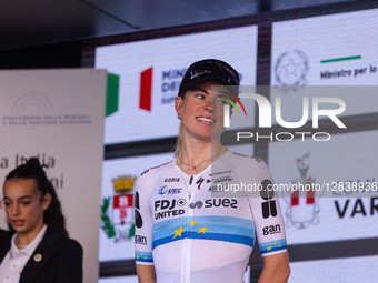 Demi Vollering participates in Tre Valli Varesine Women 2025. in Varese, Italy, on October 7, 2025.