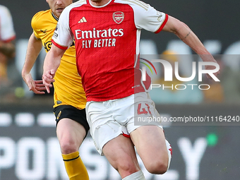 Declan Rice of Arsenal is playing during the Premier League match between Wolverhampton Wanderers and Arsenal at Molineux in Wolverhampton, on April 20, 2024.