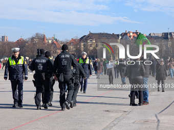 Police officers are present during a demonstration at Theresienwiese in Munich, Bavaria, Upper Bavaria, Germany, on February 8, 2025. People demonstrate against the right in Munich ahead of the 2025 general election.