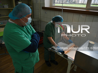 Professor Volodymyr Samaryk, a Doctor of Chemical Sciences, and Nataliia Nosova, a Senior Researcher at the Department of Organic Chemistry of the Institute of Chemistry and Chemical Technologies, are overseeing the production of medicinal hydrogel dressings at Lviv Polytechnic National University in Lviv, Ukraine, on April 2, 2024. These dressings are designed to speed up the healing process of burns and severe wounds in Ukrainian soldiers. NO USE RUSSIA. NO USE BELARUS.