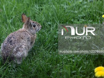 A wild rabbit forages for food in a backyard in Toronto, Ontario, Canada, on May 16, 2025.