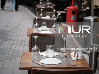 Empty tables of a restaurant in Athens, Greece on March 1, 2023.