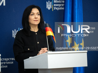 Federal Minister for Economic Affairs and Energy of Germany, Katherina Reiche, attends a joint news conference with Minister of Energy of Ukraine, Svitlana Grynchuk, to discuss the physical protection of energy facilities and further assistance from Germany in their restoration after Russian shelling in Kyiv, Ukraine, on October 25, 2025.