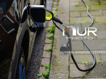 A yellow charging cable connects to a black electric vehicle parked on a cobblestone sidewalk in Venlo, Netherlands, on July 28, 2023. The image shows the extended cable running along the ground.