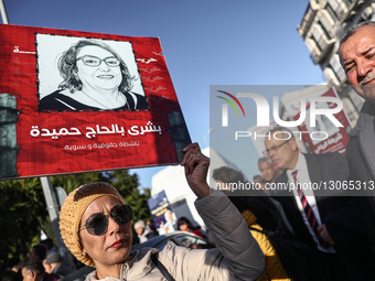 A demonstrator raises a placard featuring a hand-drawn portrait of the prominent opposition figure and human rights and feminist activist, Bochra Belhaj Hmida, during a mass march that brings together thousands of supporters of opposition parties across the political spectrum, human rights and civil society activists, and ordinary Tunisians, in Tunis, Tunisia, on December 6, 2025, to protest under the banner ''Opposition Is Not A Crime.'' They decry what they call a growing crackdown on President Kais Saied's critics and opposition parties, as well as on civil liberties, individual rights, freedom of expression, and press freedom. Participants denounce what they describe as an increasingly authoritarian and dictatorial one-man rule by the Tunisian president. The crowd expresses solidarity with opposition figures imprisoned in connection with the case known as the ''conspiracy against state security,'' demanding their release. Under President Kais Saied's rule since 2021, Tunisia sees the dissolution of parliament, the dismissal of the government, the adoption of a new constitution, the dismissal of dozens of judges, the arrest of political opponents, critics, and journalists, while the activities of dozens of organizations are suspended.