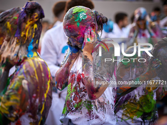 Faculty of medicine first-year students walk down a hall while seniors paint them with different color paints and glitter as part of an annual tradition during a celebration in honor of their patron Saint Lucas at Granada University in Granada, Spain, on October 18, 2024. The fourth-year students, dressed as characters from The Lord of the Rings movies, organize this year's event.