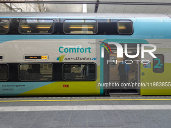 A Westbahn train is stationed at Salzburg Central Station in Salzburg, Austria, on January 25, 2025, preparing for its journey to Vienna. The modern double-decker train sits on a maintained platform, with tracks and overhead power lines visible.