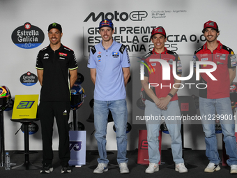 JEREZ DE LA FRONTERA, SPAIN - APRIL 24: (L-R) Franco Morbidelli of Italy and Pertamina Enduro VR46 Racing Team , Alex Marquez of Spain and Gresini Ducati, Marc Marquez of Spain and Lenovo Ducatia and Francesco ''Pecco'' Bagnaia of Italy and Ducati Lenovo Team in the press conferance ahead of the MotoGP of Spain at Circuito de Jerez on April 24, 2025 in Jerez de la Frontera, Spain.