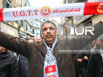 A demonstrator raises a scarf bearing the UGTT union logo during a march organized by the Tunisian General Labour Union (French: UGTT) heading towards the mausoleum of union leader Farhat Hached in Tunis, Tunisia, on December 4, 2025, to mark the 73rd anniversary of his assassination. The commemoration escalates into a protest against President Kais Saied's economic and social policies. Trade unionists demand the protection of union rights and freedoms, as well as the resumption of social dialogue and salary negotiations. The UGTT denounces that the planned salary increases in the private and public sectors, as outlined in the 2026 Finance Bill, are implemented without any social dialogue with the government. The confrontation between the UGTT and President Kais Saied's government reflects a broader political crisis that unfolds since 2021, raising concerns among trade unions and civil society actors. The UGTT warns of a potential general strike.