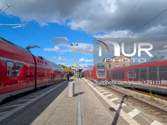 Deutsche Bahn (DB) regional trains stop at a platform while passengers walk towards the entrance under a sunny sky with clouds in Roth, Middle Franconia, Bavaria, Germany, on October 18, 2025.